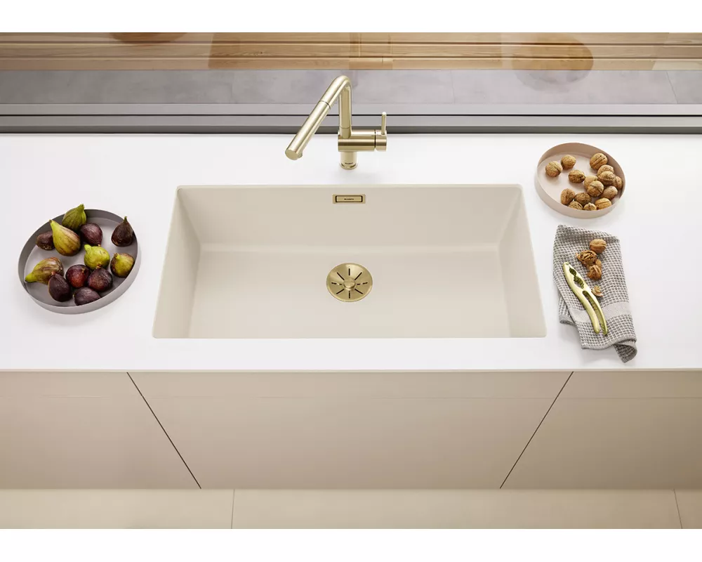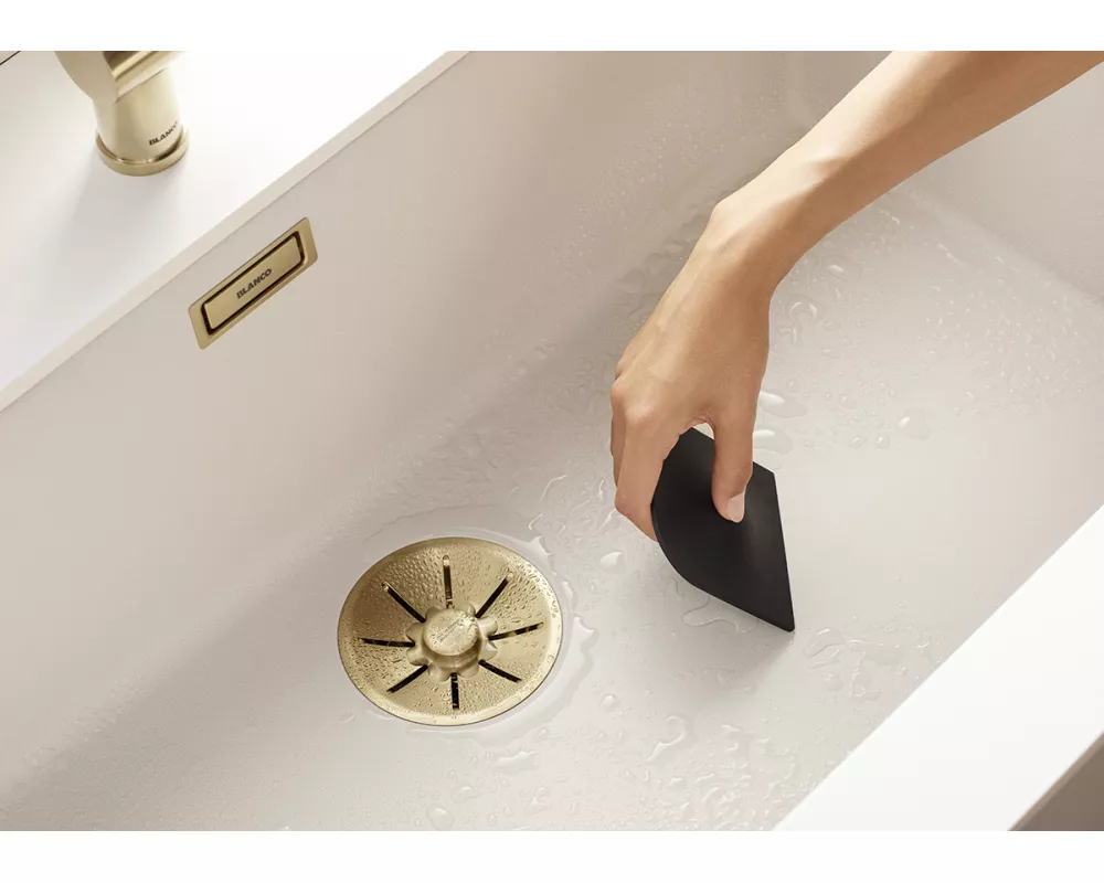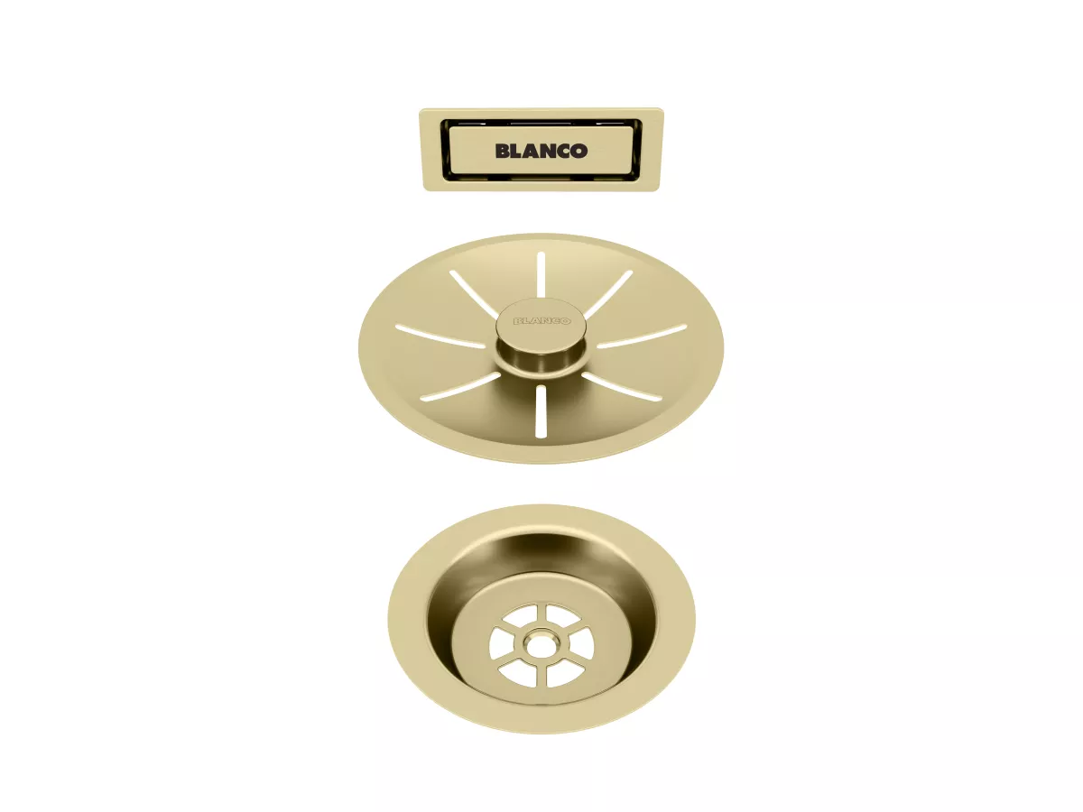 Zestaw zawiera element przelewu z logo BLANCO, nakładkę stalową i kielich odpływu wszystko w kolorze Satin GOLD. Idealne uzupełnienie do baterii kuchennej BLANCO w tym kolorze.