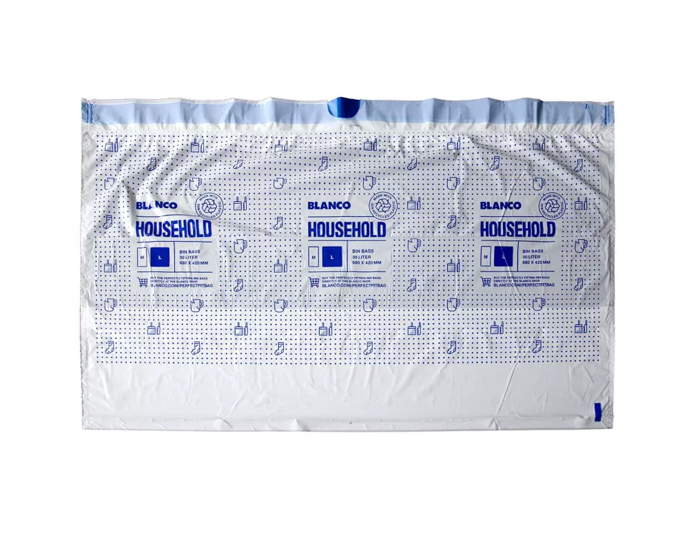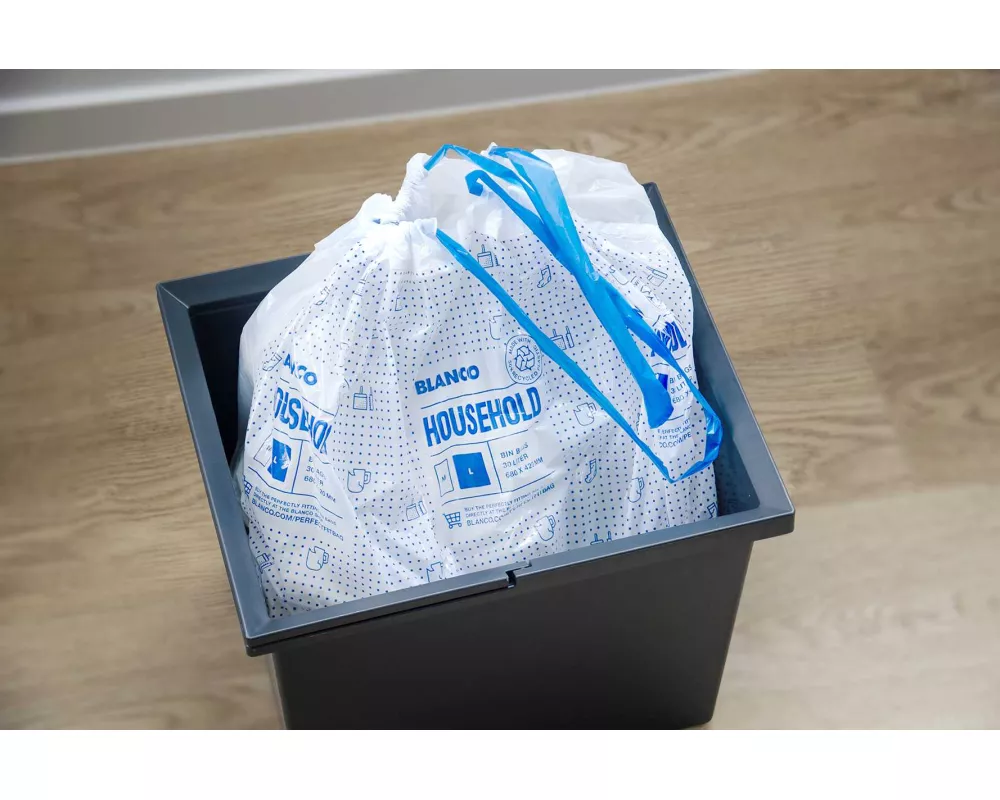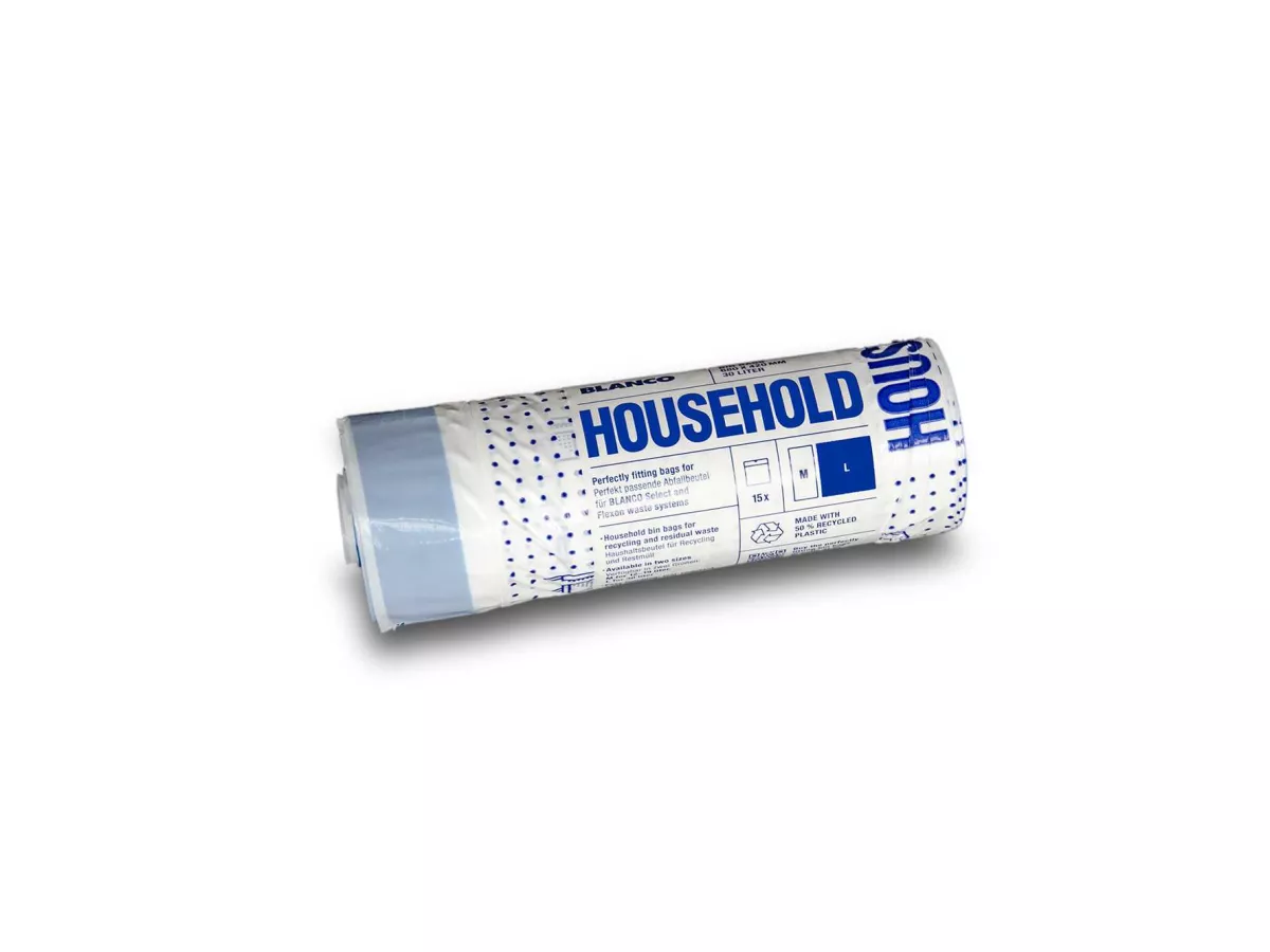 • Jedna rolka zawiera 15 sztuk worków na śmieci w rozmiarze L dopasowanych do koszy BLANCO SELECT II i FLEXON II (o pojemności 30 litrów) – idealne uzupełnienie systemu segregacji odpadków w domu