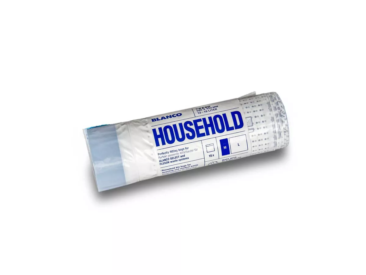 • Jedna rolka zawiera 15 sztuk worków na śmieci w rozmiarze M dopasowanych do koszy BLANCO SELECT II i FLEXON II (o pojemności 15 - 19 litrów) – idealne uzupełnienie systemu segregacji odpadków w domu