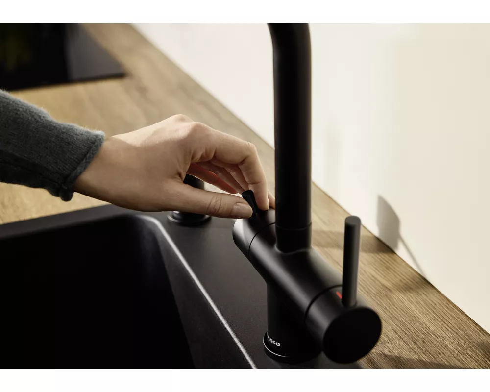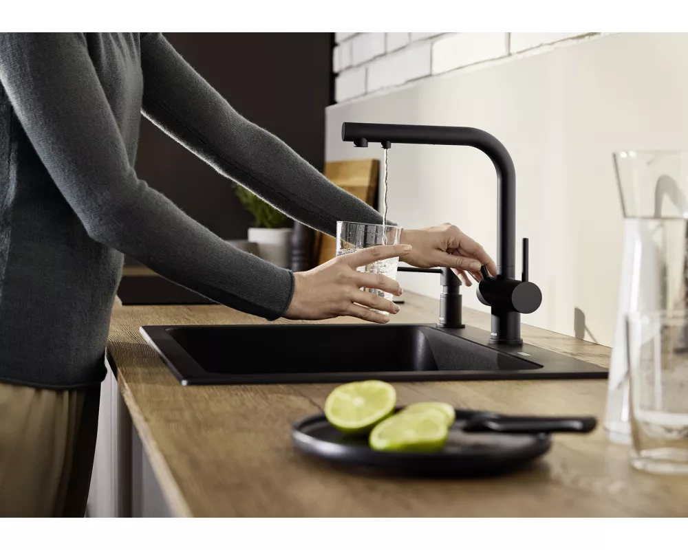 woda filtrowana i niefiltrowana z jednej wylewki z osobnymi kanałami przepływu. Posiada oddzielną dźwignię z prawej strony do wody mieszanej (ciepłej i zimnej ) oraz dźwignię do wody filtrowanej z lewej strony. Wymaga tylko jednego otworu 35 mm do zamocowania baterii, dzięki czemu mamy rozbudowany system dostarczania wody i zaoszczędzamy miejsce. Wyciągana wylewka ułatwia napełnianie naczyń.