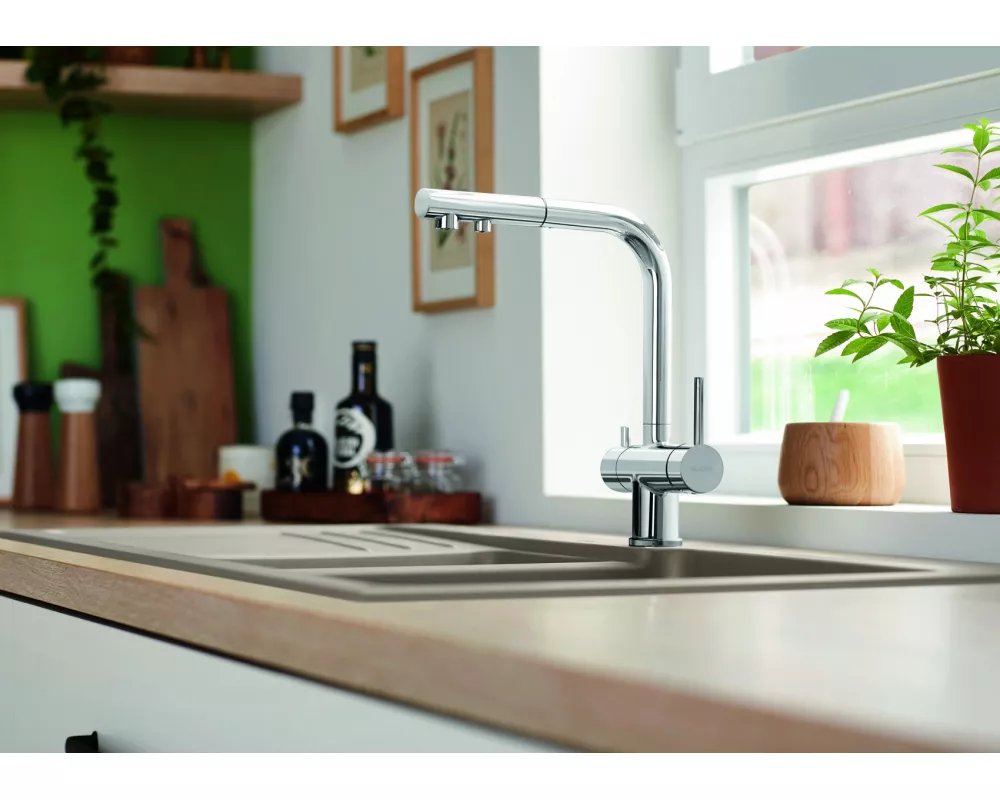 woda filtrowana i niefiltrowana z jednej wylewki z osobnymi kanałami przepływu. Posiada oddzielną dźwignię z prawej strony do wody mieszanej (ciepłej i zimnej ) oraz dźwignię do wody filtrowanej z lewej strony. Wymaga tylko jednego otworu 35 mm do zamocowania baterii, dzięki czemu mamy rozbudowany system dostarczania wody i zaoszczędzamy miejsce. Wyciągana wylewka ułatwia napełnianie naczyń.