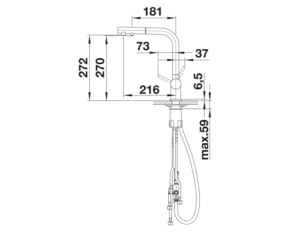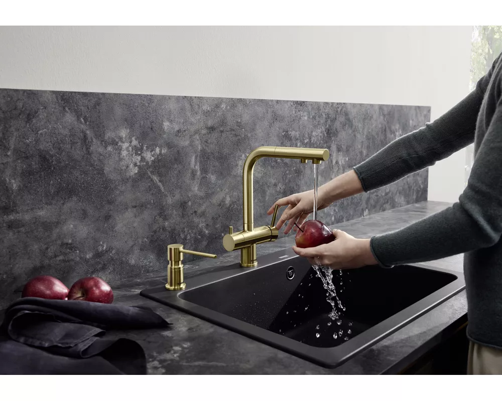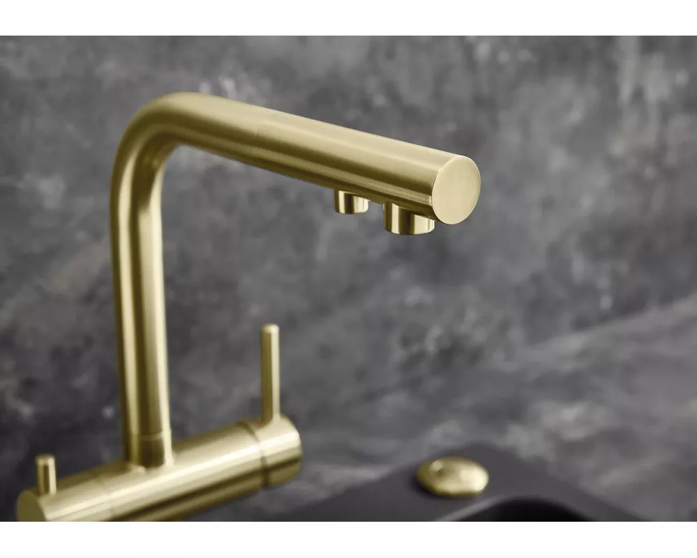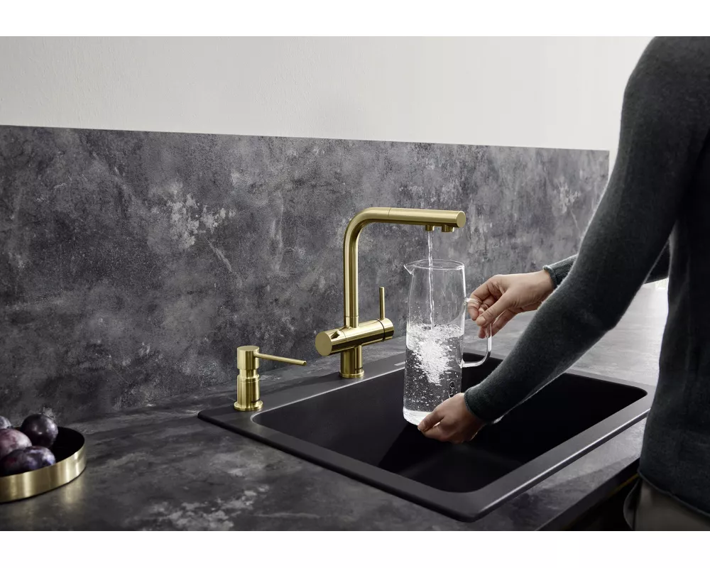 woda filtrowana i niefiltrowana z jednej wylewki z osobnymi kanałami przepływu. Posiada oddzielną dźwignię z prawej strony do wody mieszanej (ciepłej i zimnej ) oraz dźwignię do wody filtrowanej z lewej strony. Wymaga tylko jednego otworu 35 mm do zamocowania baterii, dzięki czemu mamy rozbudowany system dostarczania wody i zaoszczędzamy miejsce. Wyciągana wylewka ułatwia napełnianie naczyń.
