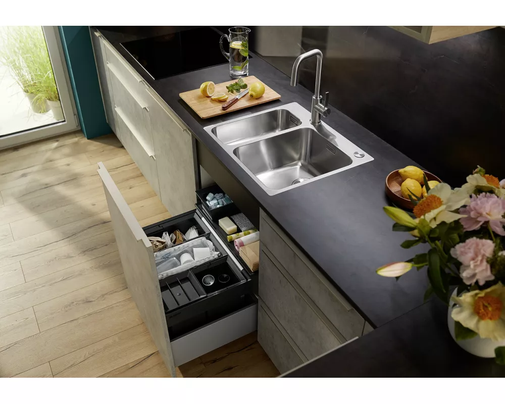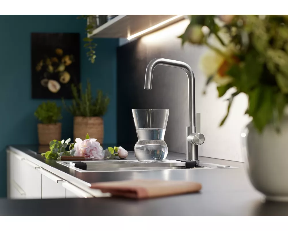 • Większa swoboda projektowania w przypadku montażu przed tylną ścianą dzięki dźwigni mieszacza z pionowym ustawieniem zerowym