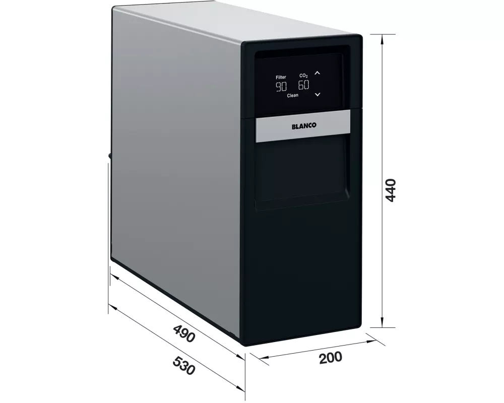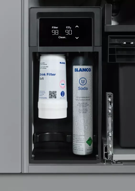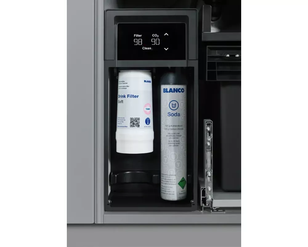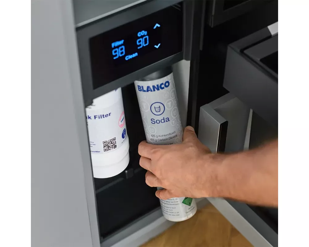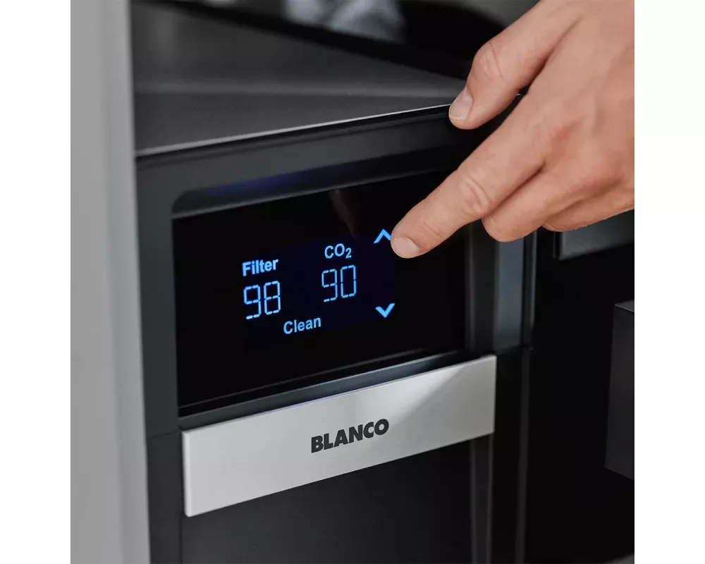 Inteligentne sterowanie: Intuicyjny ekran dotykowy oraz pełna kompatybilność z aplikacją BLANCO UNIT (iOS & Android) dla monitorowania zużycia filtra i CO2.