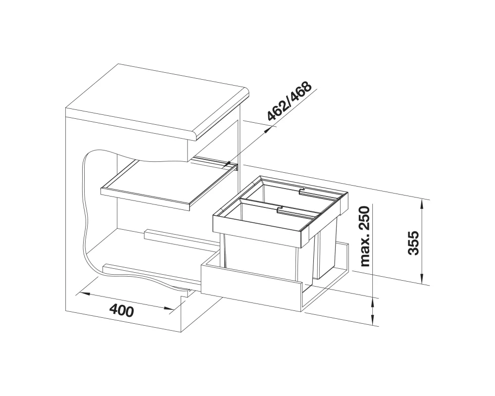 • Wysokość montażowa 355 mm nad dnem szuflady, wysokość montażowa bez pokrywy systemowej 325 mm nad dnem szuflady, głębokość montażowa 400 mm (wymiary wewnętrzne szuflady).