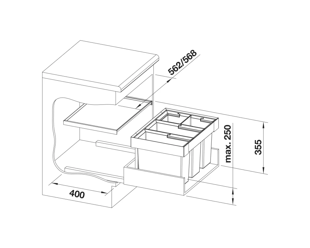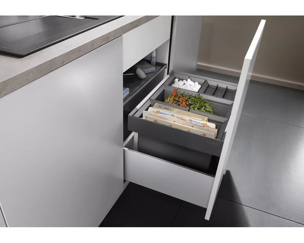 Selektor odpadów BLANCO FLEXON II 60/4 umożliwia idealne dopasowanie go do indywidualnych potrzeb: istnieje możliwość wyboru rozmiaru koszy oraz ich ustawienia w szafce/szufladzie.