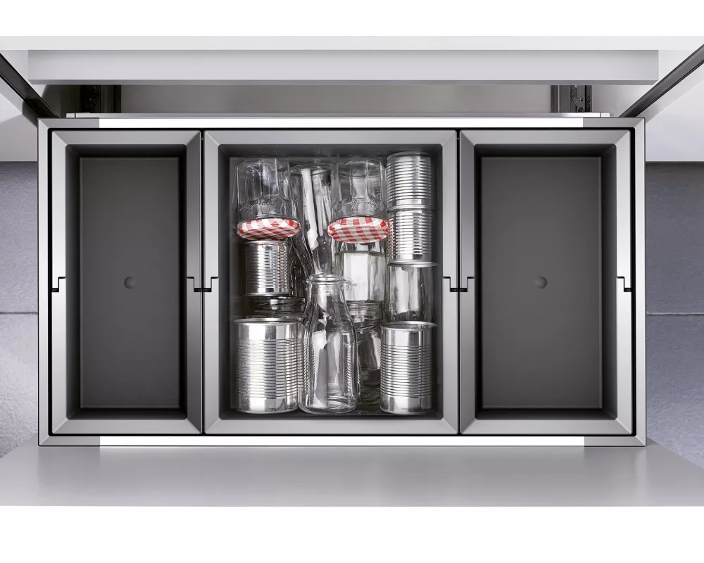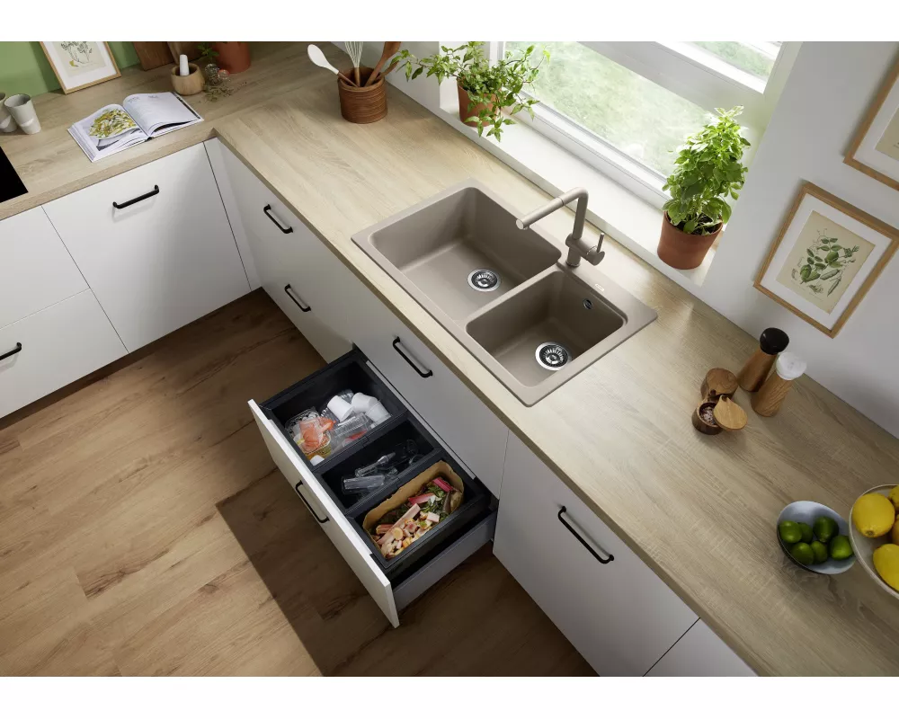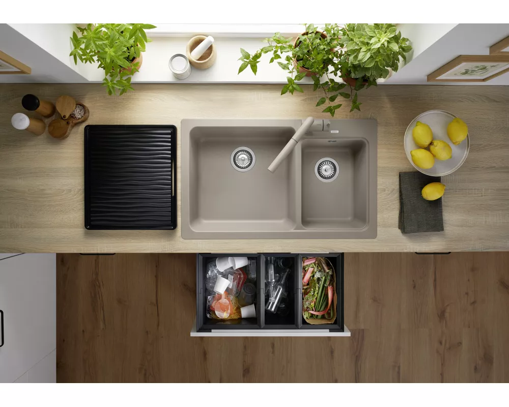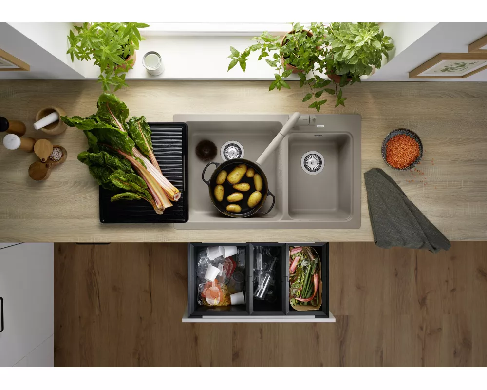 • Zróżnicowane opcje segregacji odpadów i przechowywania dzięki elastycznym kombinacjom pojemników, przy zmniejszonym zapotrzebowaniu na miejsce w szafce zlewozmywakowej