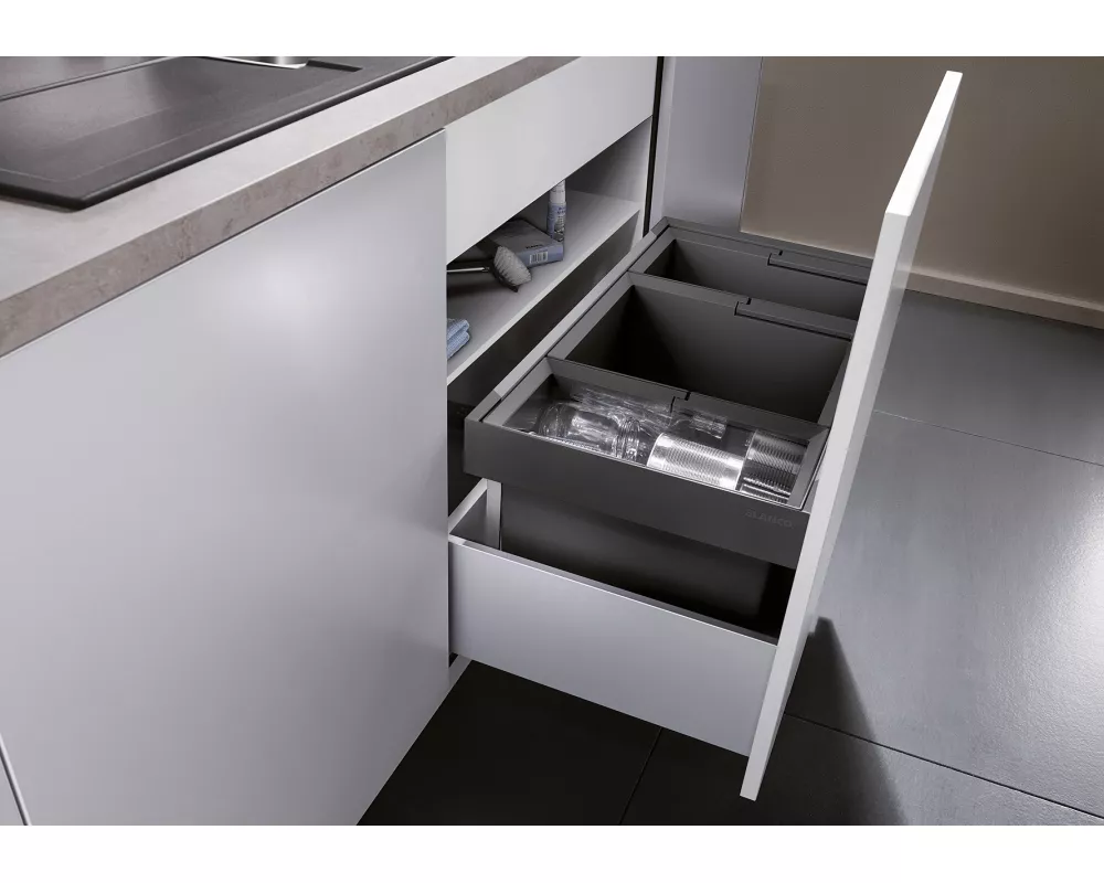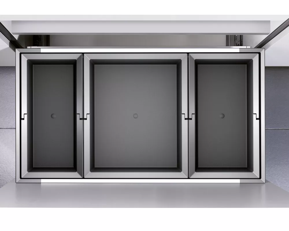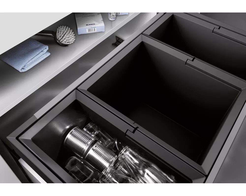 Selektor odpadów BLANCO FLEXON II Low 80/3 umożliwia idealne dopasowanie go do indywidualnych potrzeb: istnieje możliwość wyboru rozmiaru koszy oraz ich ustawienia w szafce/szufladzie.