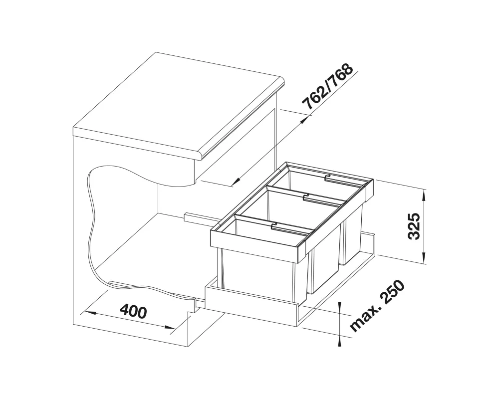 • Wysokość montażowa 325 mm nad dnem szuflady, głębokość montażowa 400 mm (wymiary wewnętrzne szuflady).