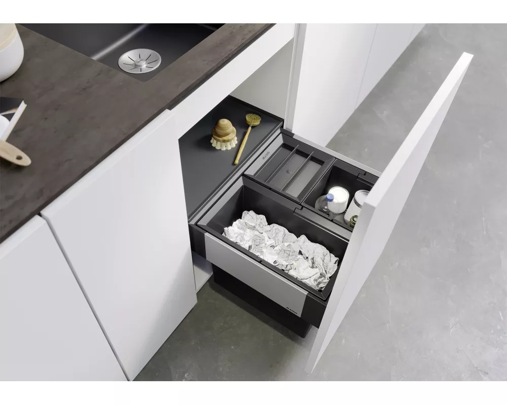 Nie ma potrzeby optycznego ukrywania systemów segregacji odpadów. Ciemne tworzywo sztuczne w połączeniu z aluminiowymi elementami zapewnia stylowy, nowoczesny wygląd.