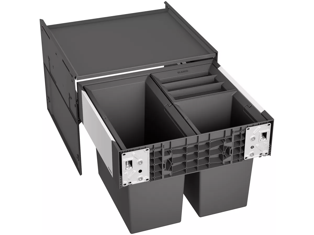 To, co było dobre, teraz stało się jeszcze lepsze. Dzięki BLANCO SELECT II przestrzeń pod zlewozmywakiem staje się idealnie dostosowana do potrzeb użytkowników. BLANCO SELECT II łączy w sobie wszystkie zalety praktycznego i higienicznego systemu segregacji odpadków. Możliwość dopasowania do każdej szafki, opcja dowolnej konfiguracji koszy różnej wielkości i umieszczenia wysuwanej szuflady organizacyjnej, a także prosty montaż bez nawiercania zapewniają optymalne wykorzystanie przestrzeni pod zlewozmywakiem i ułatwiają sortowanie domowych odpadów. Nakładana pokrywka z filtrem węglowym zapobiega wydostawaniu się zapachom z kosza bio.
