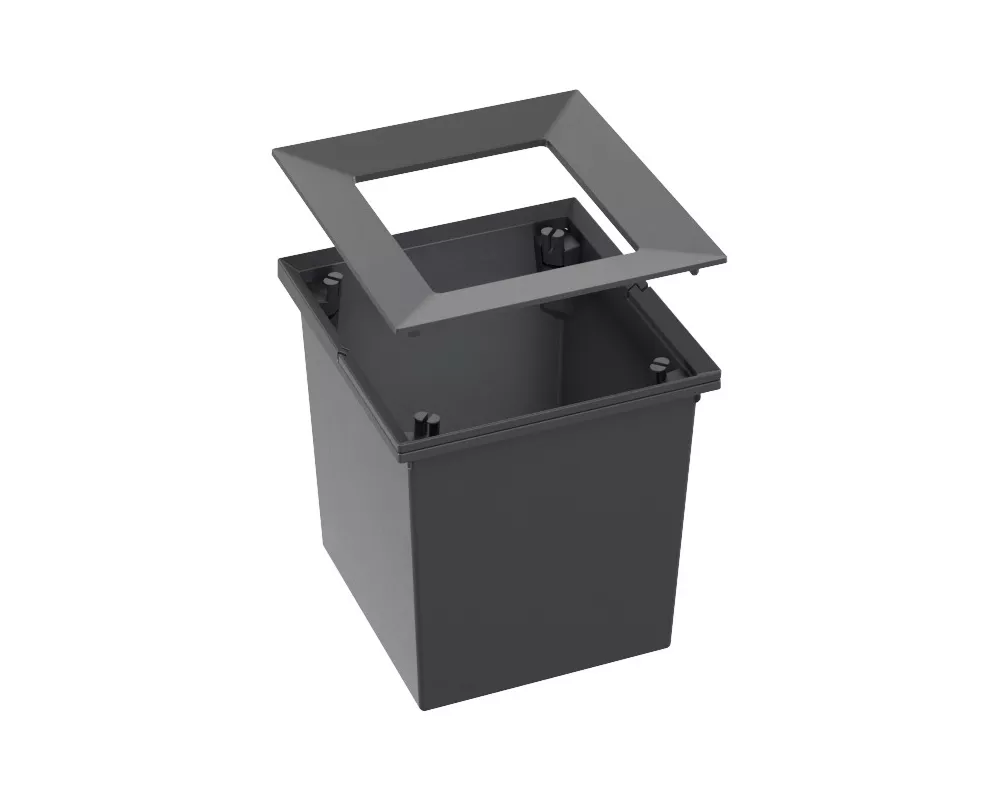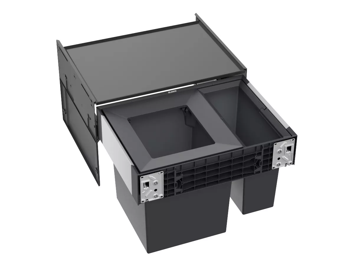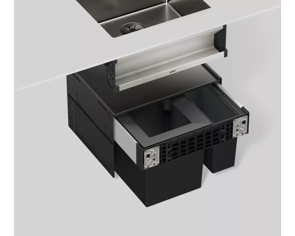 System do wysuwania kosza mocowany do frontu szafki, pokrywa systemowa, 1 x kosz 35l plus 1 x kosz 6l oraz niezbędne elementy montażowe.