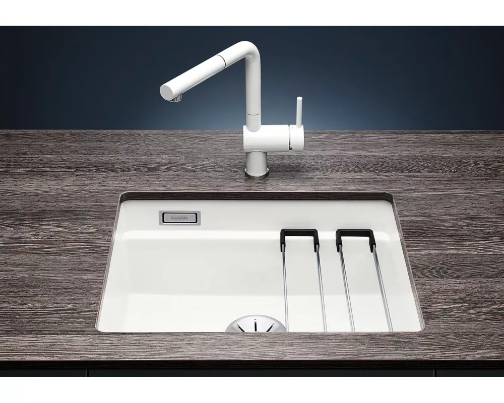 BLANCO ETAGON to wyjątkowy zlewozmywak posiadający wewnątrz komory wyprofilowaną krawędź, na której można oprzeć bardzo stabilne szyny ze stali szlachetnej. Na takich szynach postawimy np. pojemniki, garnki lub patelnie. Warzywa pokrojone na desce do krojenia, opartej na krawędzi komory, łatwo zsuniemy bezpośrednio do naczynia ustawionego na szynach w komorze. Dzięki temu zyskujemy dodatkowy funkcjonalny poziom, a zwykła pojedyncza komora staje się samowystarczalnym centrum kuchennym. Do tego modelu zlewozmywaka można dobrać praktyczną narożną odsączarkę, przenośny ociekacz i deskę do krojenia, która po zakryciu nią komory będzie stanowiła przedłużenie zlewozmywaka. BLANCO Etagon jest dostępny w wielu wariantach kolorystycznych w opcji z Silgranitu, a także w 4 kolorach w ceramice oraz w wersji ze stali szlachetnej.