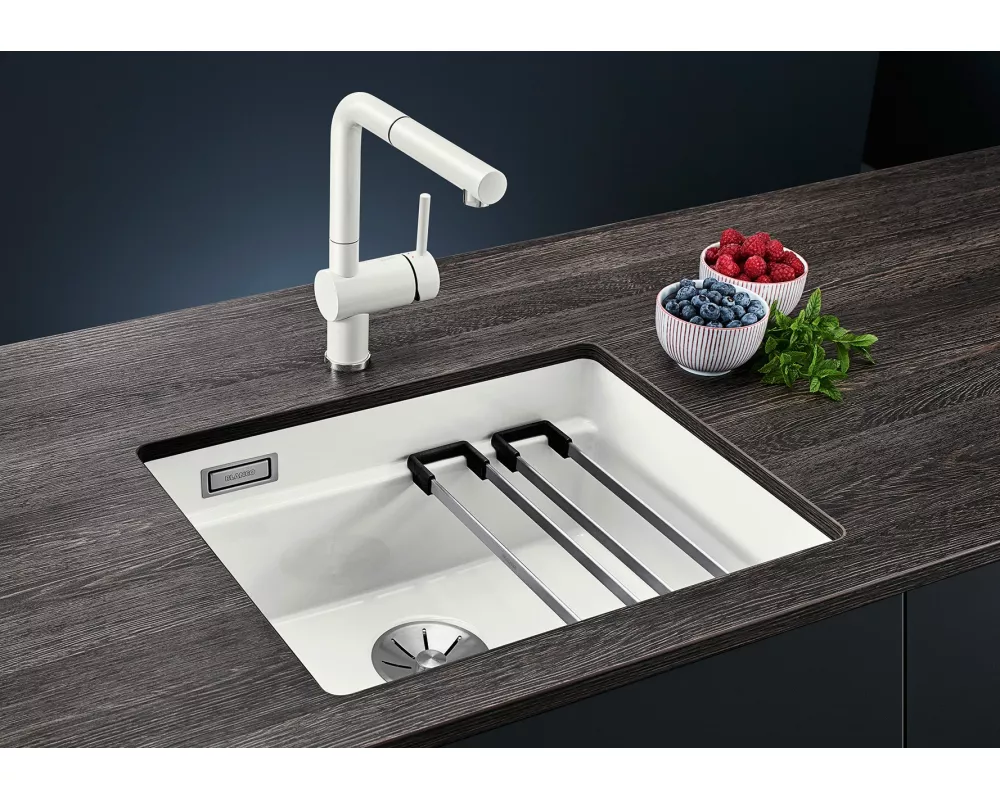 BLANCO ETAGON to wyjątkowy zlewozmywak posiadający wewnątrz komory wyprofilowaną krawędź, na której można oprzeć bardzo stabilne szyny ze stali szlachetnej. Na takich szynach postawimy np. pojemniki, garnki lub patelnie. Warzywa pokrojone na desce do krojenia, opartej na krawędzi komory, łatwo zsuniemy bezpośrednio do naczynia ustawionego na szynach w komorze. Dzięki temu zyskujemy dodatkowy funkcjonalny poziom, a zwykła pojedyncza komora staje się samowystarczalnym centrum kuchennym. Do tego modelu zlewozmywaka można dobrać praktyczną narożną odsączarkę, przenośny ociekacz i deskę do krojenia, która po zakryciu nią komory będzie stanowiła przedłużenie zlewozmywaka. BLANCO Etagon jest dostępny w wielu wariantach kolorystycznych w opcji z Silgranitu, a także w 4 kolorach w ceramice oraz w wersji ze stali szlachetnej.