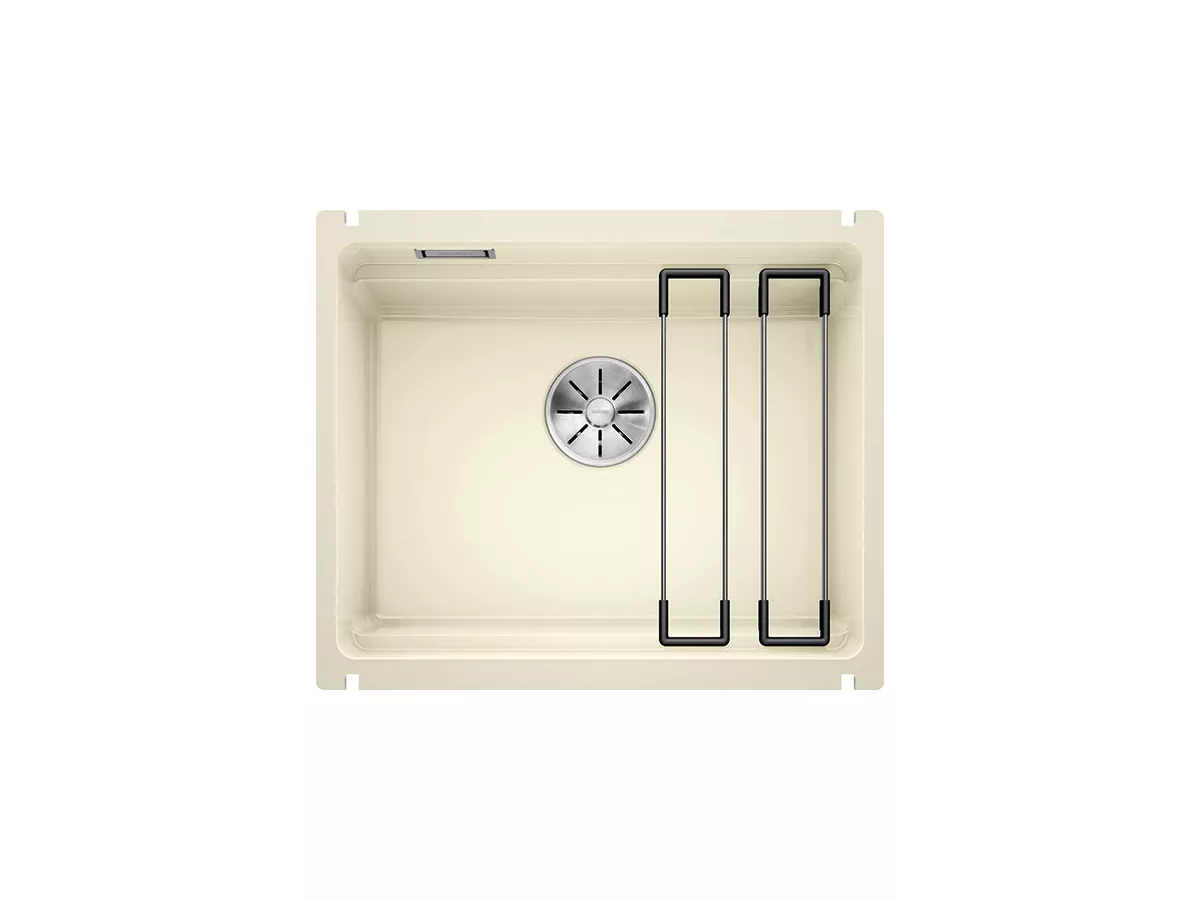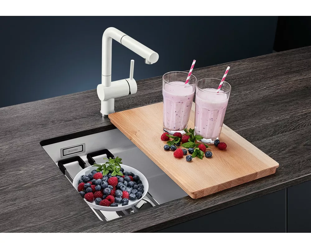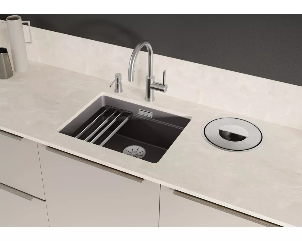 BLANCO ETAGON to wyjątkowy zlewozmywak posiadający wewnątrz komory wyprofilowaną krawędź, na której można oprzeć bardzo stabilne szyny ze stali szlachetnej. Na takich szynach postawimy np. pojemniki, garnki lub patelnie. Warzywa pokrojone na desce do krojenia, opartej na krawędzi komory, łatwo zsuniemy bezpośrednio do naczynia ustawionego na szynach w komorze. Dzięki temu zyskujemy dodatkowy funkcjonalny poziom, a zwykła pojedyncza komora staje się samowystarczalnym centrum kuchennym. Do tego modelu zlewozmywaka można dobrać praktyczną narożną odsączarkę, przenośny ociekacz i deskę do krojenia, która po zakryciu nią komory będzie stanowiła przedłużenie zlewozmywaka. BLANCO Etagon jest dostępny w wielu wariantach kolorystycznych w opcji z Silgranitu, a także w 4 kolorach w ceramice oraz w wersji ze stali szlachetnej.