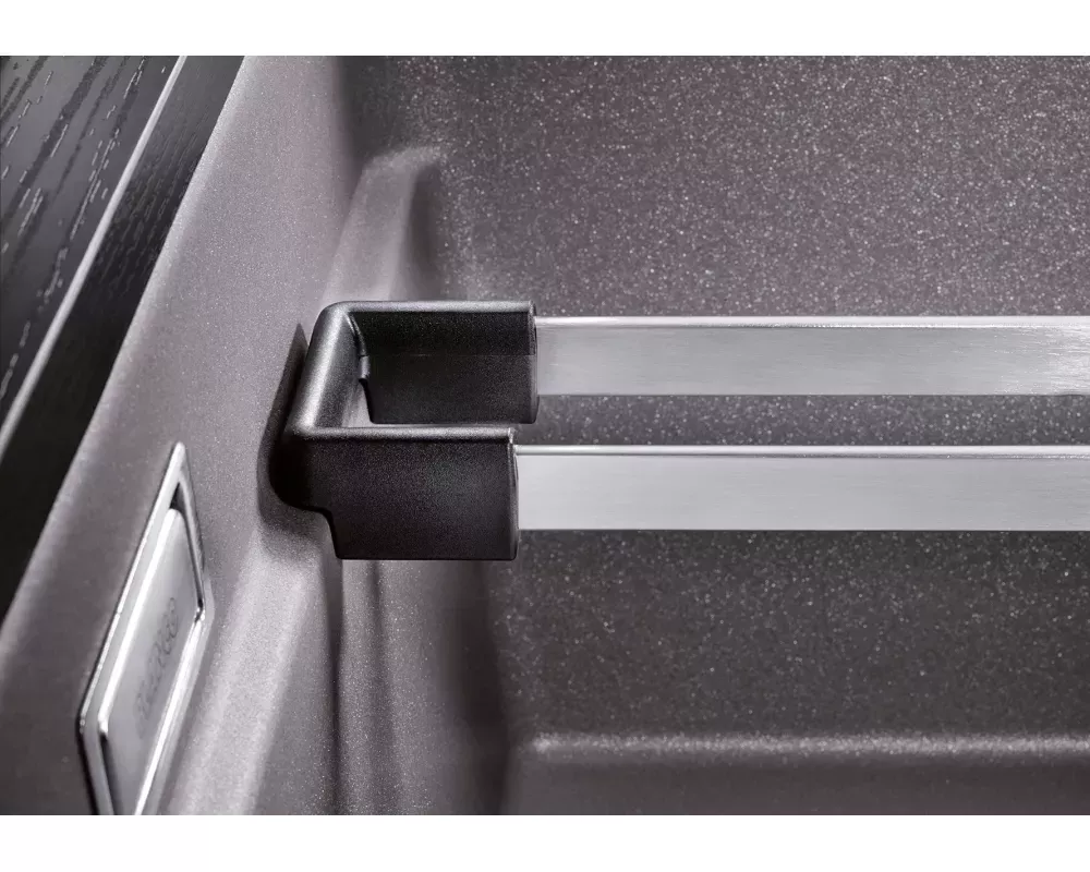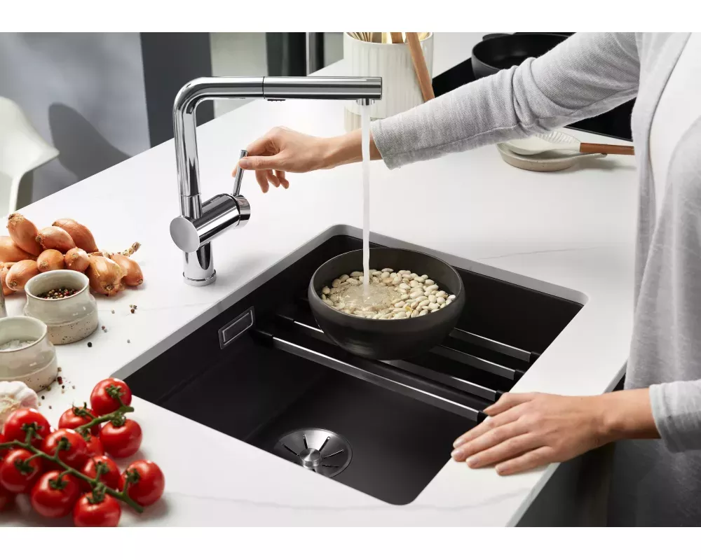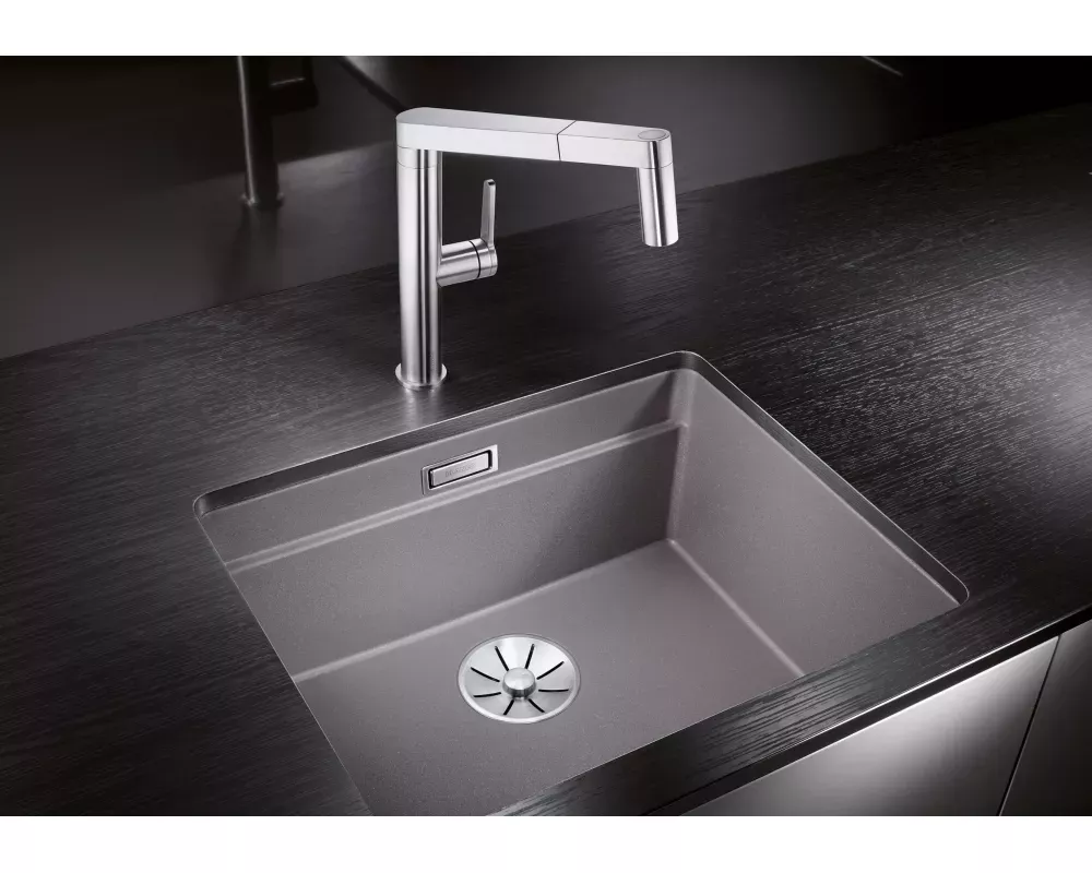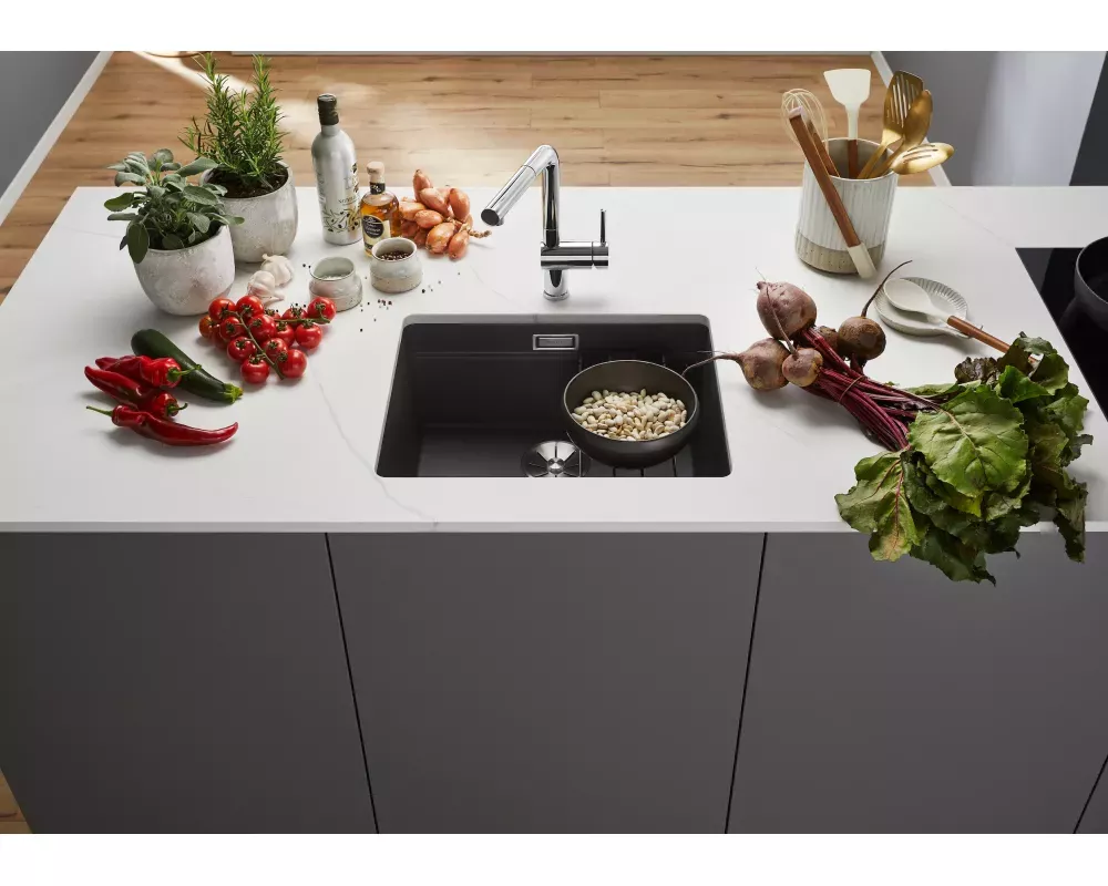 BLANCO ETAGON to wyjątkowy zlewozmywak posiadający wewnątrz komory wyprofilowaną krawędź, na której można oprzeć bardzo stabilne szyny ze stali szlachetnej. Na takich szynach postawimy np. pojemniki, garnki lub patelnie. Warzywa pokrojone na desce do krojenia, opartej na krawędzi komory, łatwo zsuniemy bezpośrednio do naczynia ustawionego na szynach w komorze. Dzięki temu zyskujemy dodatkowy funkcjonalny poziom, a zwykła pojedyncza komora staje się samowystarczalnym centrum kuchennym. Do tego modelu zlewozmywaka można dobrać praktyczną narożną odsączarkę, przenośny ociekacz i deskę do krojenia, która po zakryciu nią komory będzie stanowiła przedłużenie zlewozmywaka. BLANCO Etagon jest dostępny w wielu wariantach kolorystycznych w opcji z Silgranitu, a także w 4 kolorach w ceramice oraz w wersji ze stali szlachetnej.