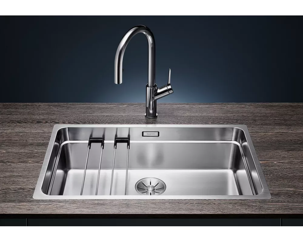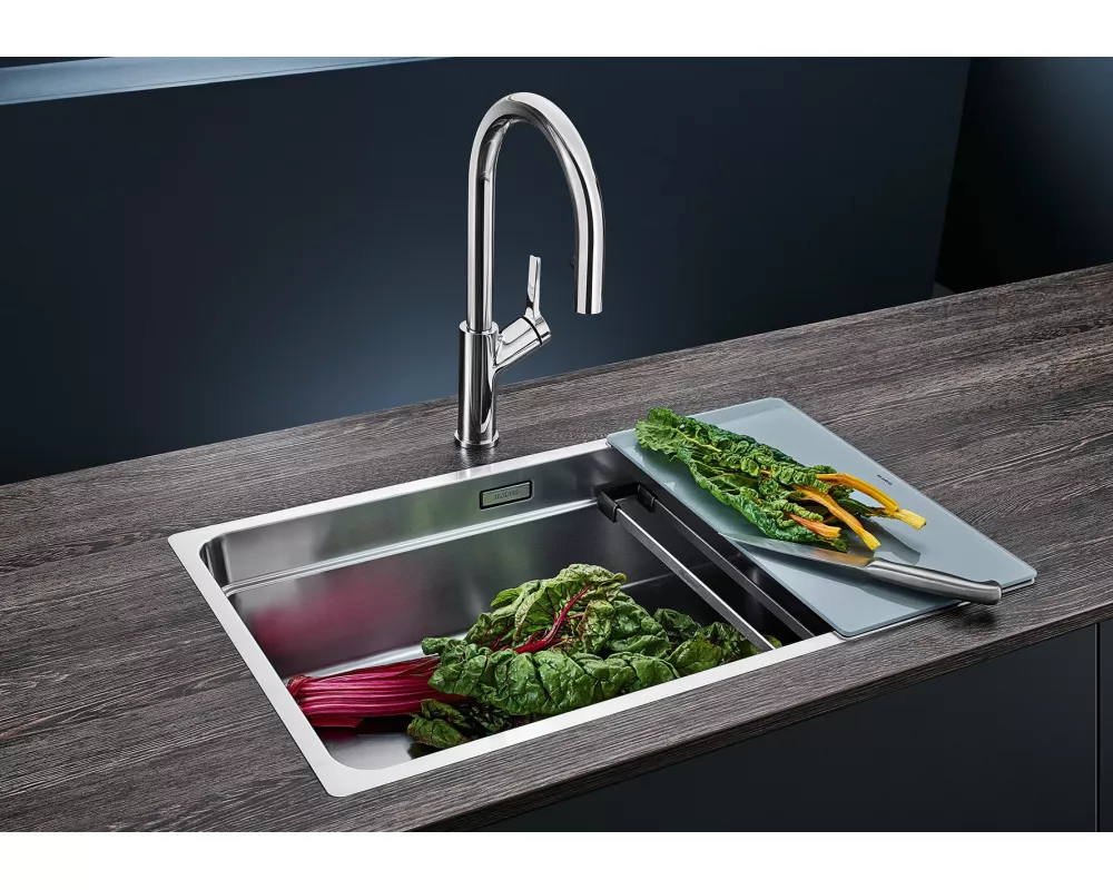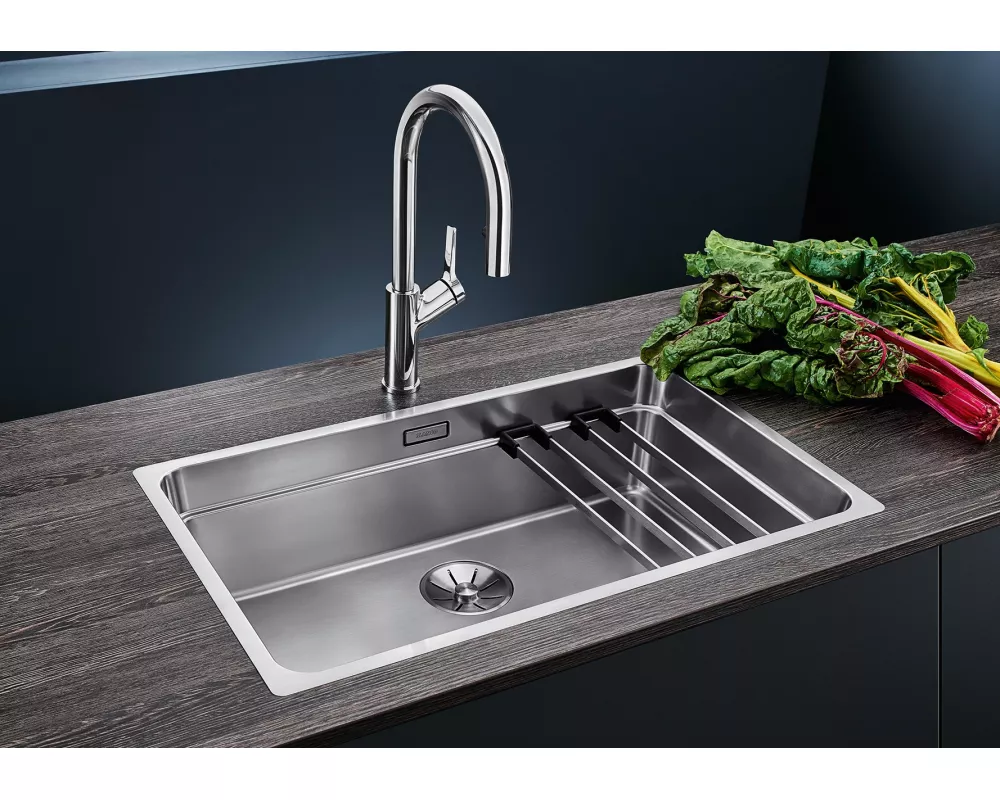 BLANCO ETAGON to wyjątkowy zlewozmywak posiadający wewnątrz komory wyprofilowaną krawędź, na której można oprzeć bardzo stabilne szyny ze stali szlachetnej. Na takich szynach postawimy np. pojemniki, garnki lub patelnie. Warzywa pokrojone na desce do krojenia, opartej na krawędzi komory, łatwo zsuniemy bezpośrednio do naczynia ustawionego na szynach w komorze. Dzięki temu zyskujemy dodatkowy funkcjonalny poziom, a zwykła pojedyncza komora staje się samowystarczalnym centrum kuchennym. Do tego modelu zlewozmywaka można dobrać praktyczną narożną odsączarkę, przenośny ociekacz i deskę do krojenia, która po zakryciu nią komory będzie stanowiła przedłużenie zlewozmywaka. BLANCO Etagon jest dostępny w wielu wariantach kolorystycznych w opcji z Silgranitu, a także w 4 kolorach w ceramice oraz w wersji ze stali szlachetnej.
