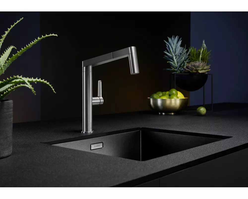 Precyzyjnie zaprojektowane, prostokątne komory w kolorze ciemnoszarego metalu podkreślają minimalistyczny, lecz wyrazisty styl, który doskonale wpisuje się w nowoczesne wnętrza. Jego ciemna powierzchnia ze stali szlachetnej daje przyjemne ciepło w dotyku, co odróżnia go od tradycyjnych, chłodnych zlewozmywaków. Wbudowana krawędź oraz detale z polerowanej stali, takie jak system odpływowo-przelewowy, dopełniają całości, tworząc harmonijną i luksusową kompozycję.